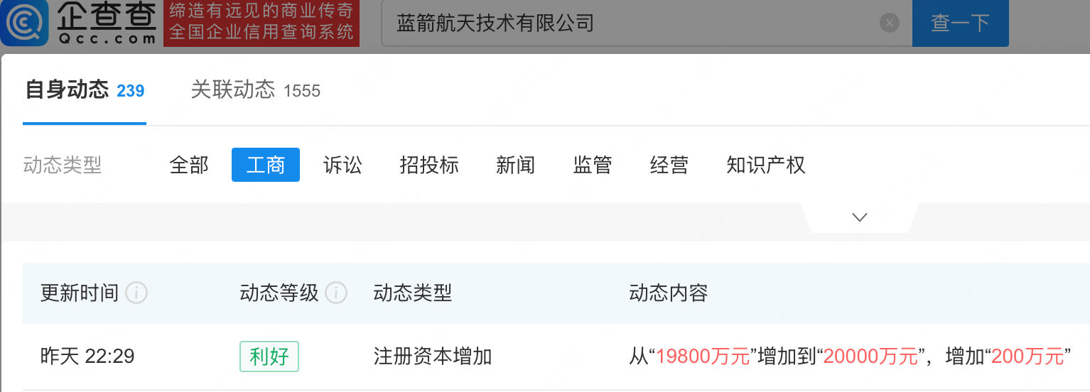 企查查APP显示,近日,蓝箭航天技术有限公司发生工商变更,注册资本由1.98亿元增至2亿元。企查查信息显示,该公司成立于2018年,经营范围包含:运载火箭、航天器、液体发动机、姿控发动机、运载火箭及航天器配套零部件、配套设备的设计等,由蓝箭航天空间科技股份有限公司全资持股。