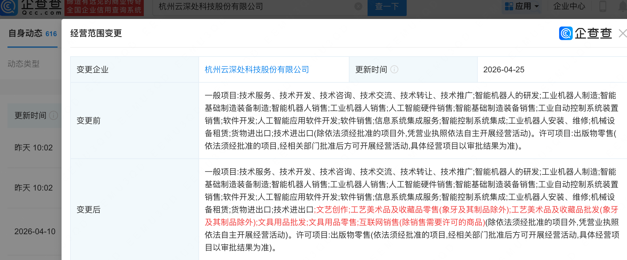 企查查APP显示,近日,杭州云深处科技股份有限公司发生工商变更,经营范围新增文艺创作、工艺美术品及收藏品零售(象牙及其制品除外)、工艺美术品及收藏品批发(象牙及其制品除外)等,同时主要人员发生变更。企查查信息显示,该公司成立于2017年,注册资本3.78亿元。