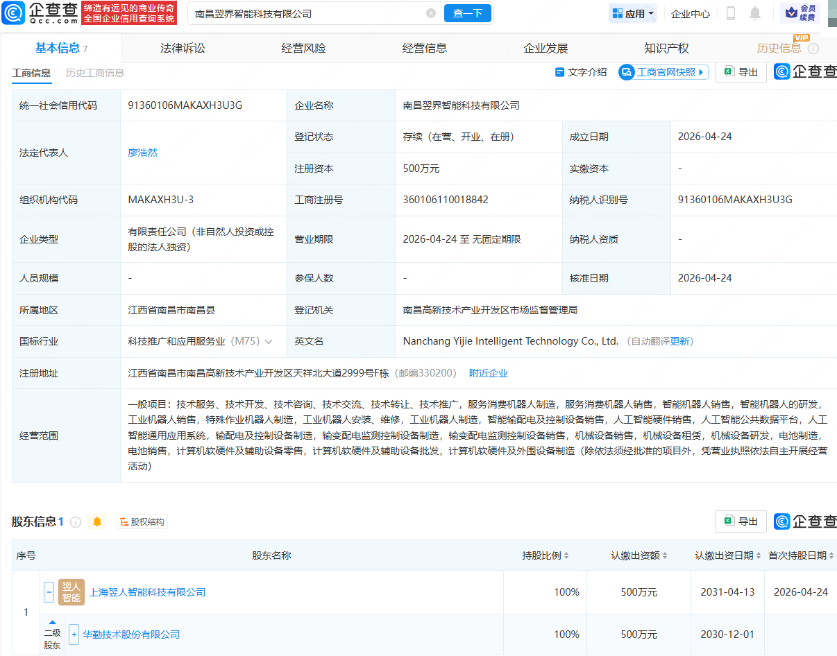企查查APP显示,近日,南昌翌界智能科技有限公司成立,法定代表人为廖浩然,经营范围包含:服务消费机器人制造,服务消费机器人销售,智能机器人销售,智能机器人的研发,工业机器人销售等。企查查股权穿透显示,该公司由华勤技术(603296.SH)间接全资持股。