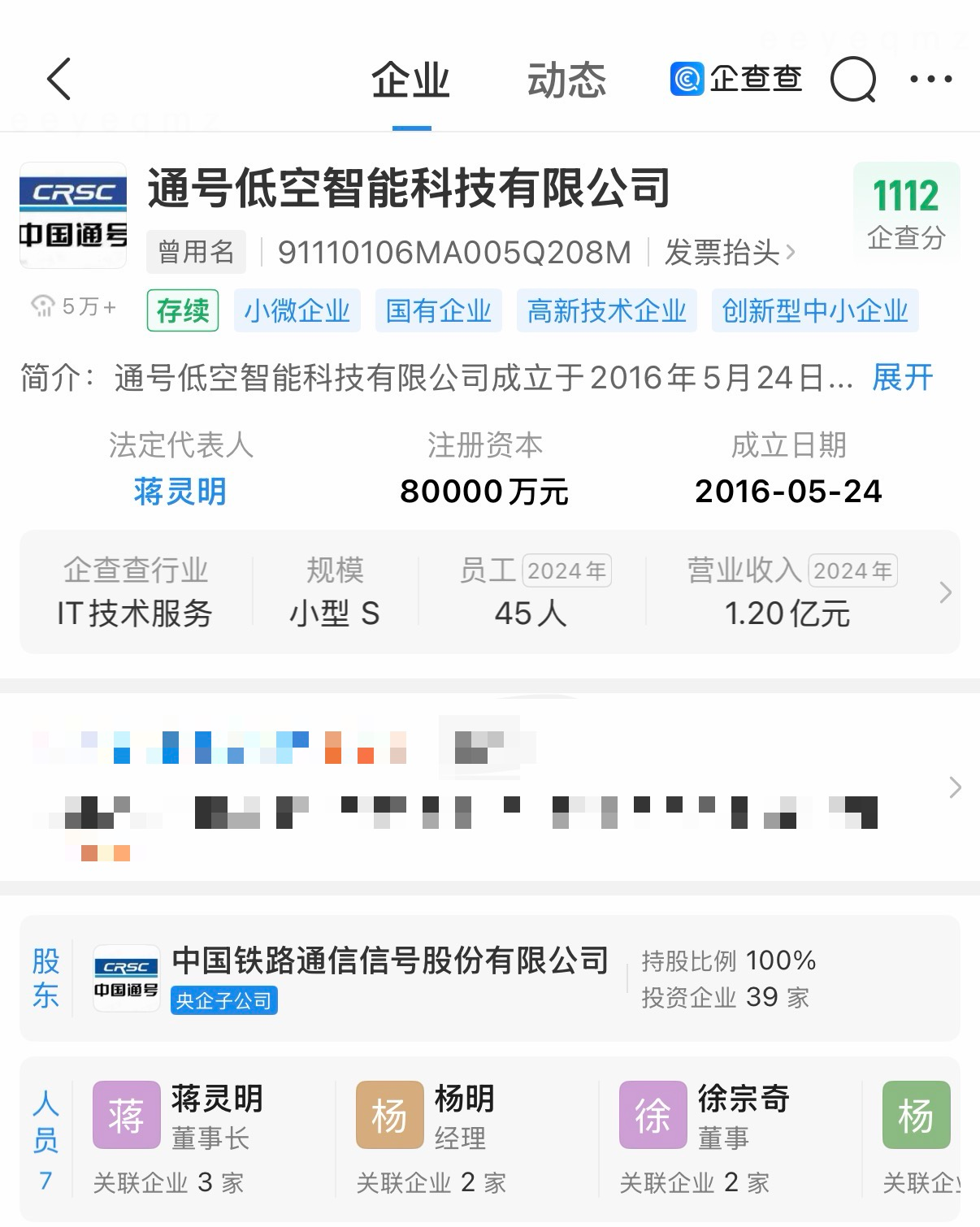 企查查显示,通号低空智能科技有限公司成立于2016年5月,法定代表人为蒋灵明,由中国通号(688009.SH)全资持股。