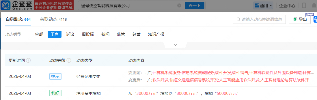 企查查APP显示,近日,通号低空智能科技有限公司发生工商变更,注册资本由3亿元增加至8亿元,增幅约为166.67%;同时经营范围变更为:人工智能应用软件开发;人工智能理论与算法软件开发;智能机器人的研发;卫星技术综合应用系统集成等。