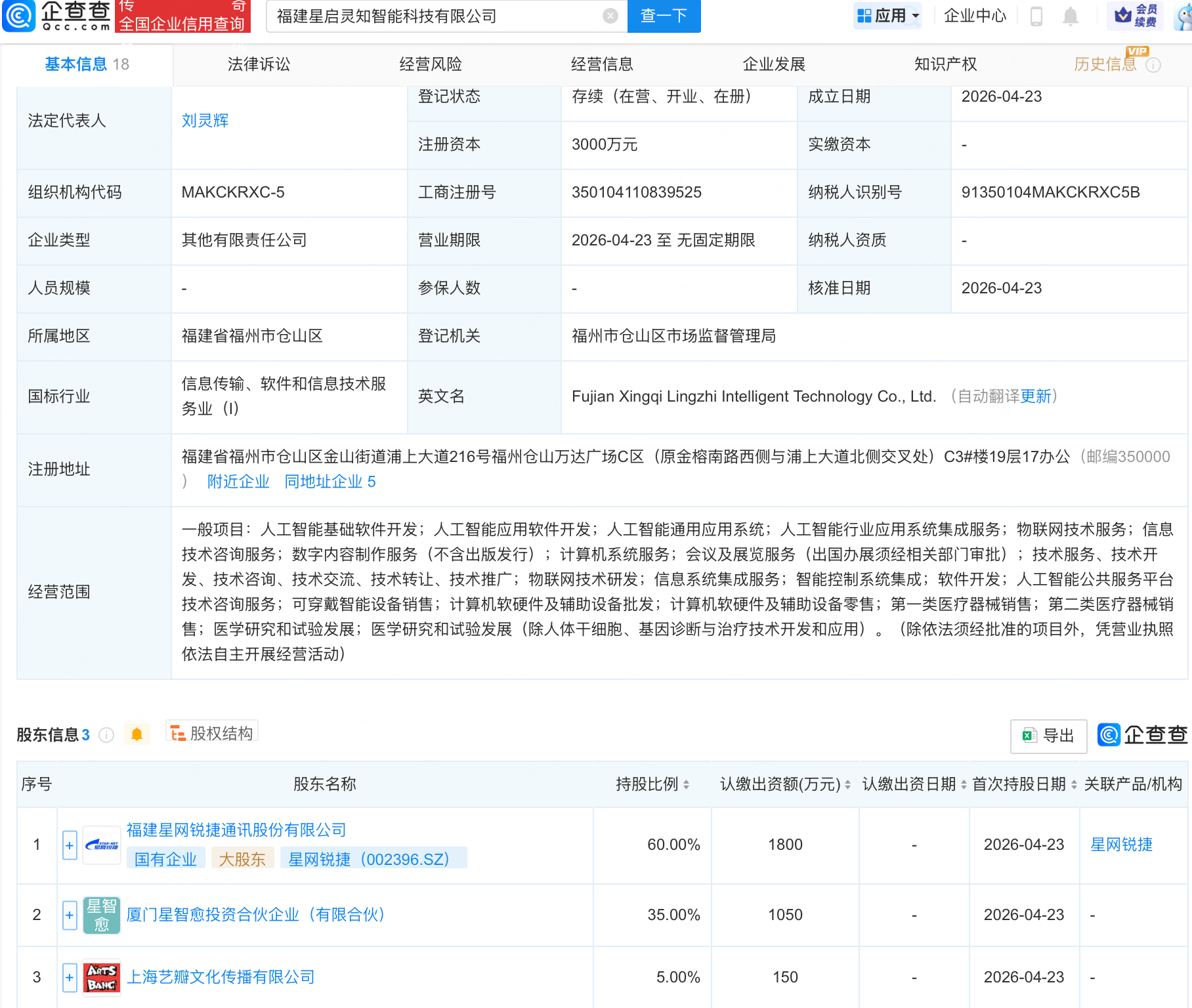 企查查APP显示,近日,福建星启灵知智能科技有限公司成立,注册资本3000万元,经营范围包含:人工智能基础软件开发;人工智能应用软件开发;人工智能通用应用系统;人工智能行业应用系统集成服务;物联网技术服务等。企查查股权穿透显示,该公司由星网锐捷(002396.SZ)等共同持股。