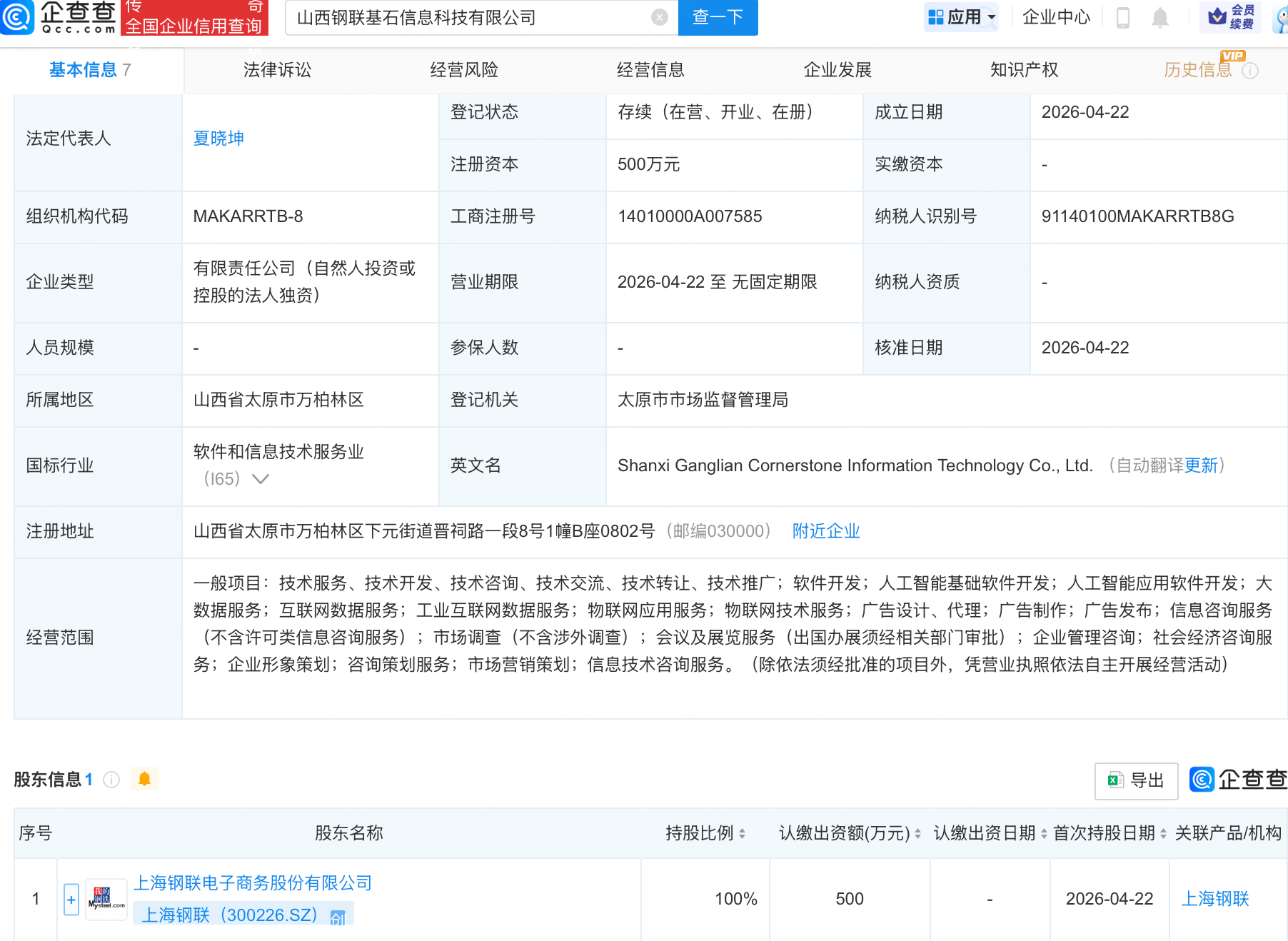 企查查APP显示,近日,山西钢联基石信息科技有限公司成立,经营范围包含:人工智能基础软件开发;人工智能应用软件开发;大数据服务;互联网数据服务等。企查查股权穿透显示,该公司由上海钢联(300226.SZ)全资持股。