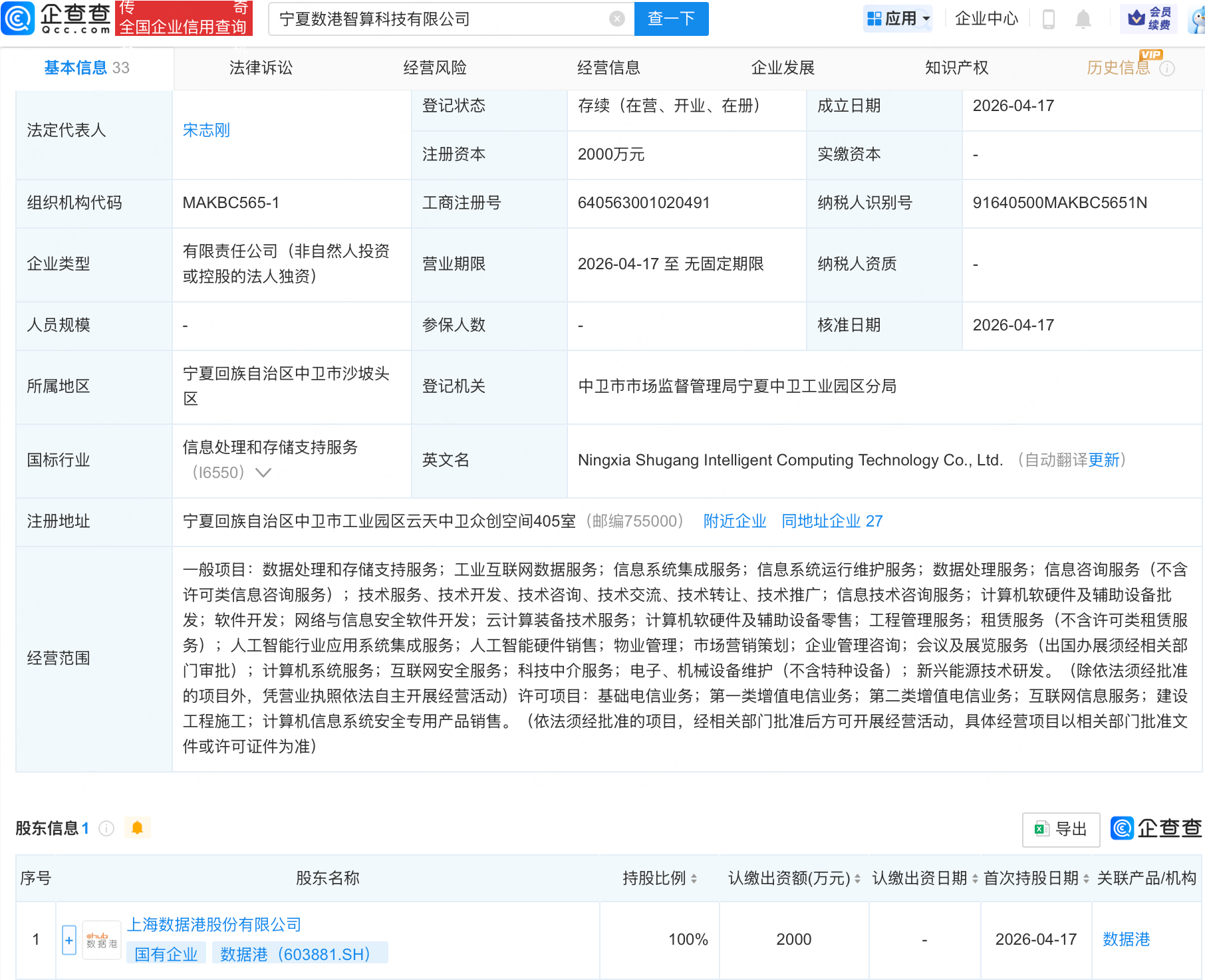 企查查APP显示,近日,宁夏数港智算科技有限公司成立,注册资本2000万元,经营范围包含:人工智能行业应用系统集成服务;人工智能硬件销售;物业管理;市场营销策划等。企查查股权穿透显示,该公司由数据港(603881.SH)全资持股。