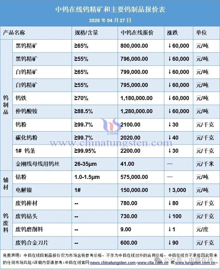 4月27日,中钨在线发布消息,周一钨价显著下移,主因周末翔鹭钨业(002842.SZ)更新的长协报价明确下调,重挫市场信心,前期缺乏成交支撑的区间高位报价难以为继,整体钨制品价格中枢探低。