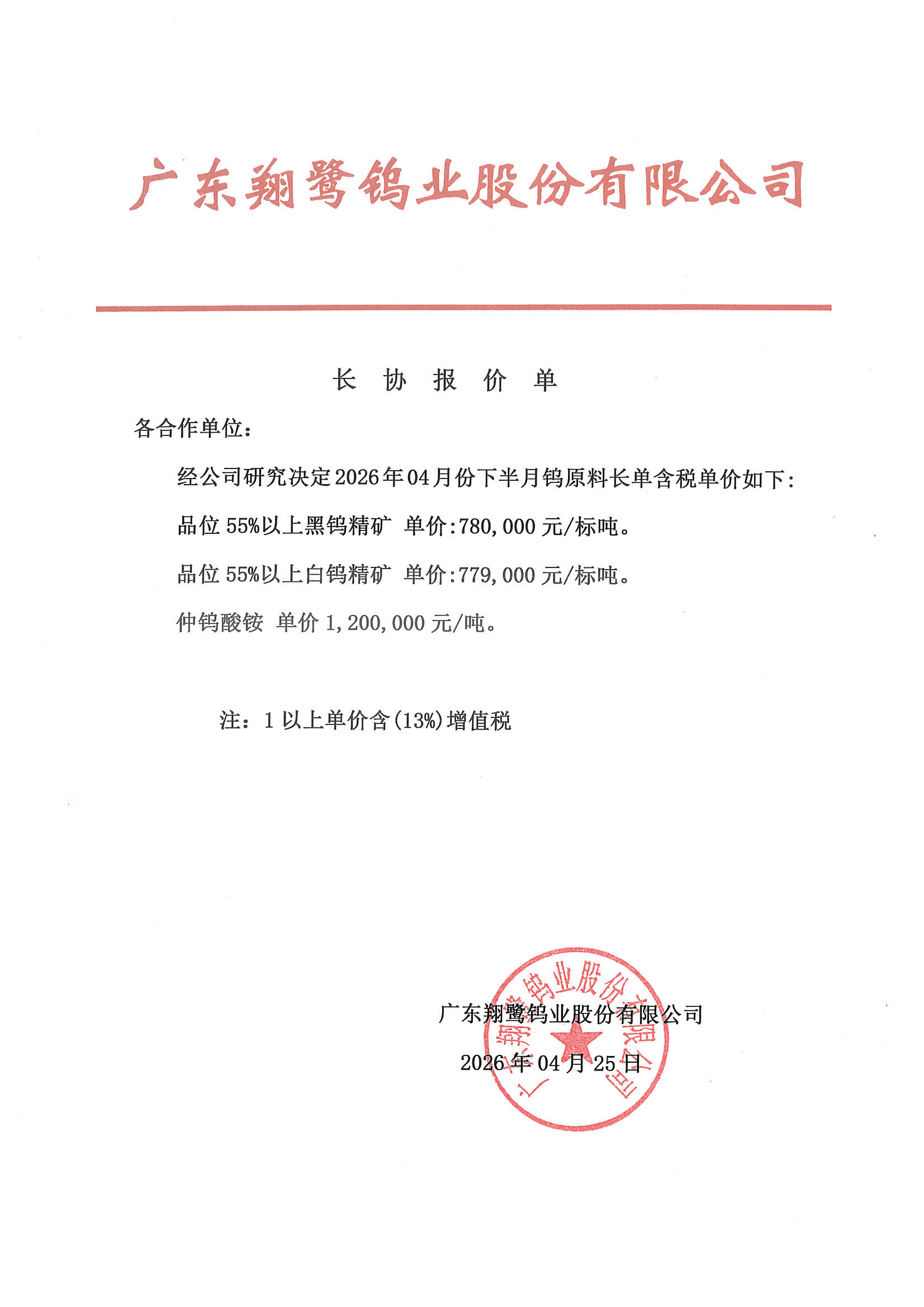 翔鹭钨业长协降价,钨精矿重挫6万元/吨