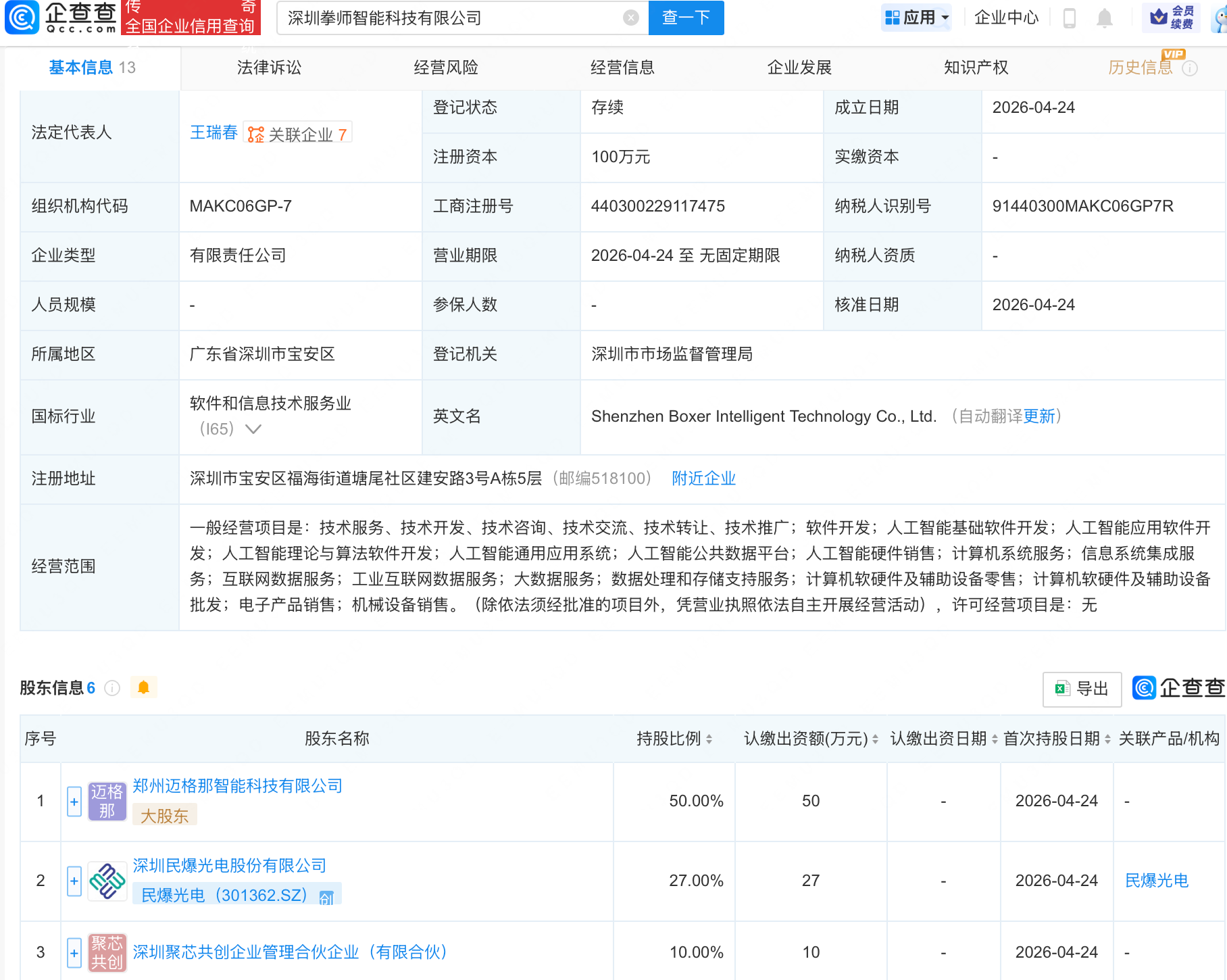 企查查APP显示,近日,深圳拳师智能科技有限公司成立,经营范围包含:人工智能基础软件开发;人工智能应用软件开发;人工智能理论与算法软件开发;人工智能通用应用系统;人工智能公共数据平台等。企查查股权穿透显示,该公司由民爆光电(301362.SZ)等共同持股。