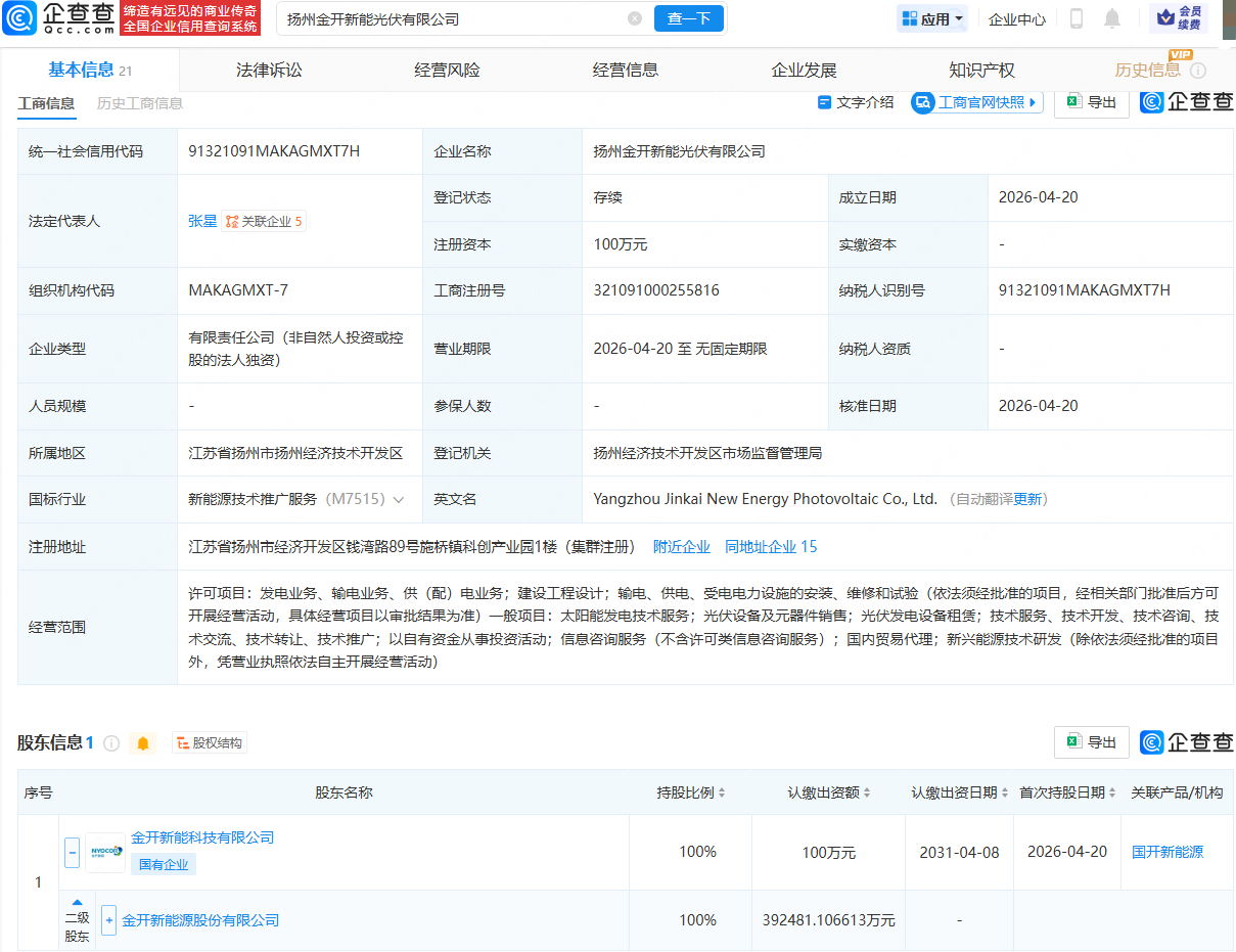企查查APP显示,近日,扬州金开新能光伏有限公司成立,法定代表人为张星,经营范围包含:发电业务、输电业务、供(配)电业务;太阳能发电技术服务;光伏设备及元器件销售等。企查查股权穿透显示,该公司由金开新能(600821.SH)间接全资持股。
