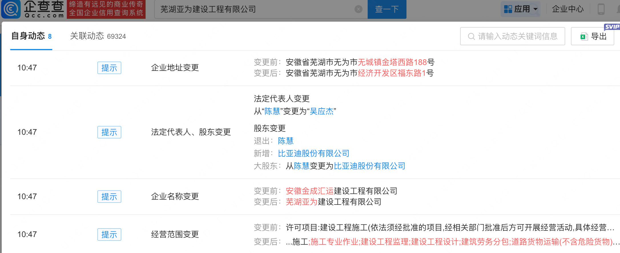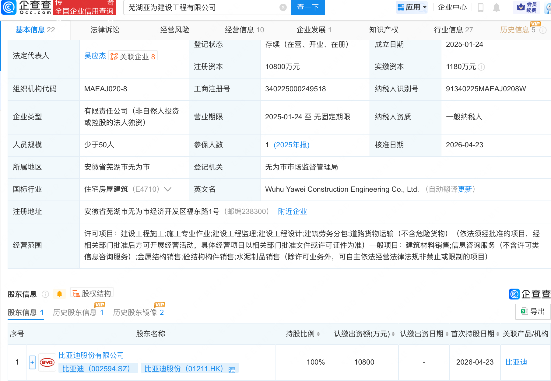 企查查APP显示,近日,原安徽金成汇运建设工程有限公司发生工商变更,企业名称变更为芜湖亚为建设工程有限公司,原股东陈慧退出,新增比亚迪(002594.SZ)为全资股东,同时,多位高管发生变更。企查查信息显示,该公司成立于2025年1月,注册资本1.08亿人民币,经营范围含建设工程施工、施工专业作业、建设工程监理、建设工程设计等。