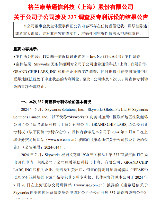 4月27日,康希通信(688653.SH)公告称,公司获悉美国国际贸易委员会(ITC)基于撤诉协议正式终止Inv.No.337-TA-1413案件调查。同时,Skyworks无条件撤回对公司子公司康希通信科技(上海)有限公司、GRANDCHIPLABS,INC.和相关企业的337调查,并撤回在美国加州中区联邦地区法院处于中止状态的专利诉讼,且获得法院同意。至此,公司涉及本次337调查和专利诉讼的事项全部终止。