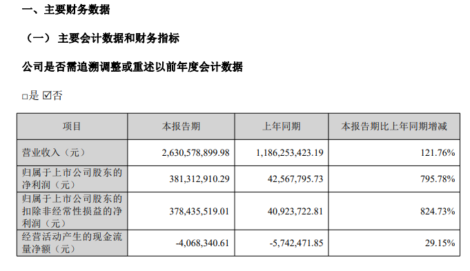 2026年第一季度营业收入26.31亿元,同比增长121.76%。净利润3.81亿元,同比增长795.78%。