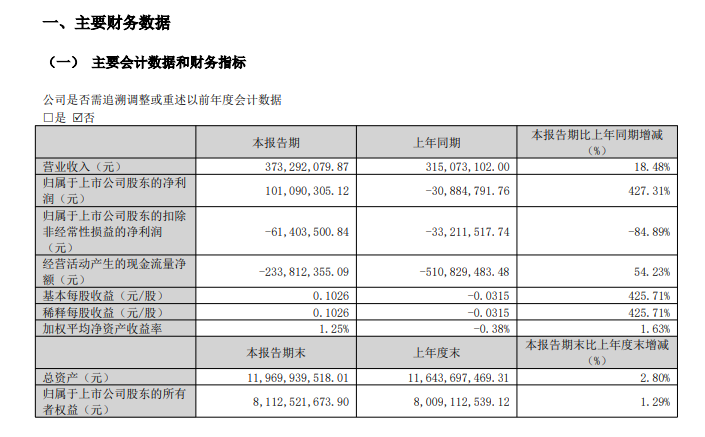 2026年第一季度营收为3.73亿元,同比增长18.48%;净利润为1.01亿元,同比增长427.31%。