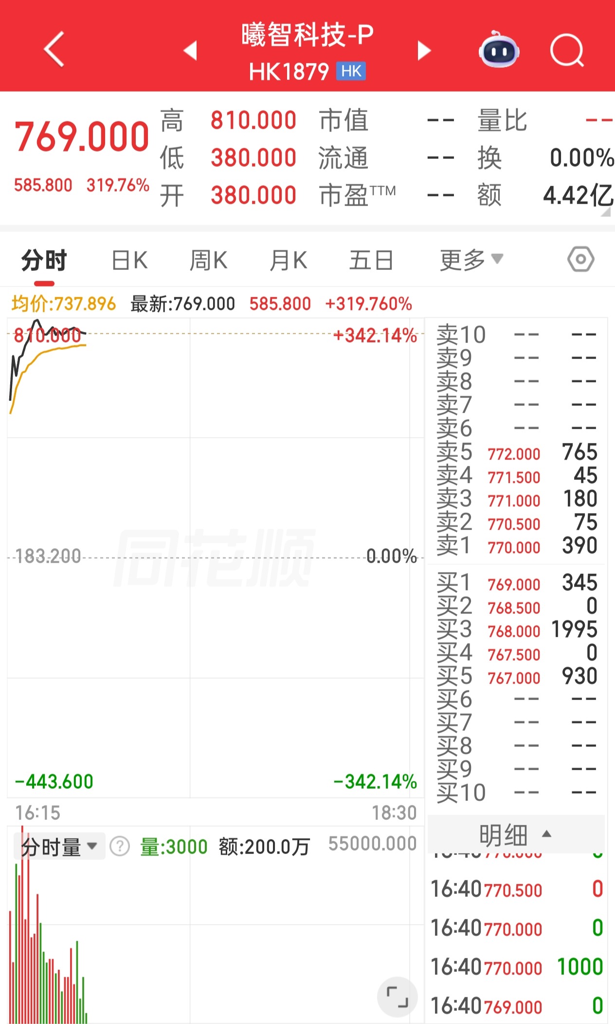 4月27日,曦智科技-P(01879.HK)暗盘涨超300%,截至发稿,报769港元/股。