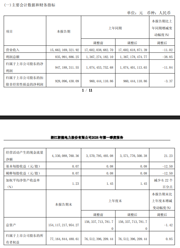4月27日,浙能电力(600023.SH)发布2026年第一季度业绩报告,实现营业收入156.62亿元,同比下降11.02%;归属于上市公司股东的净利润为9.47亿元,同比下降11.84%。