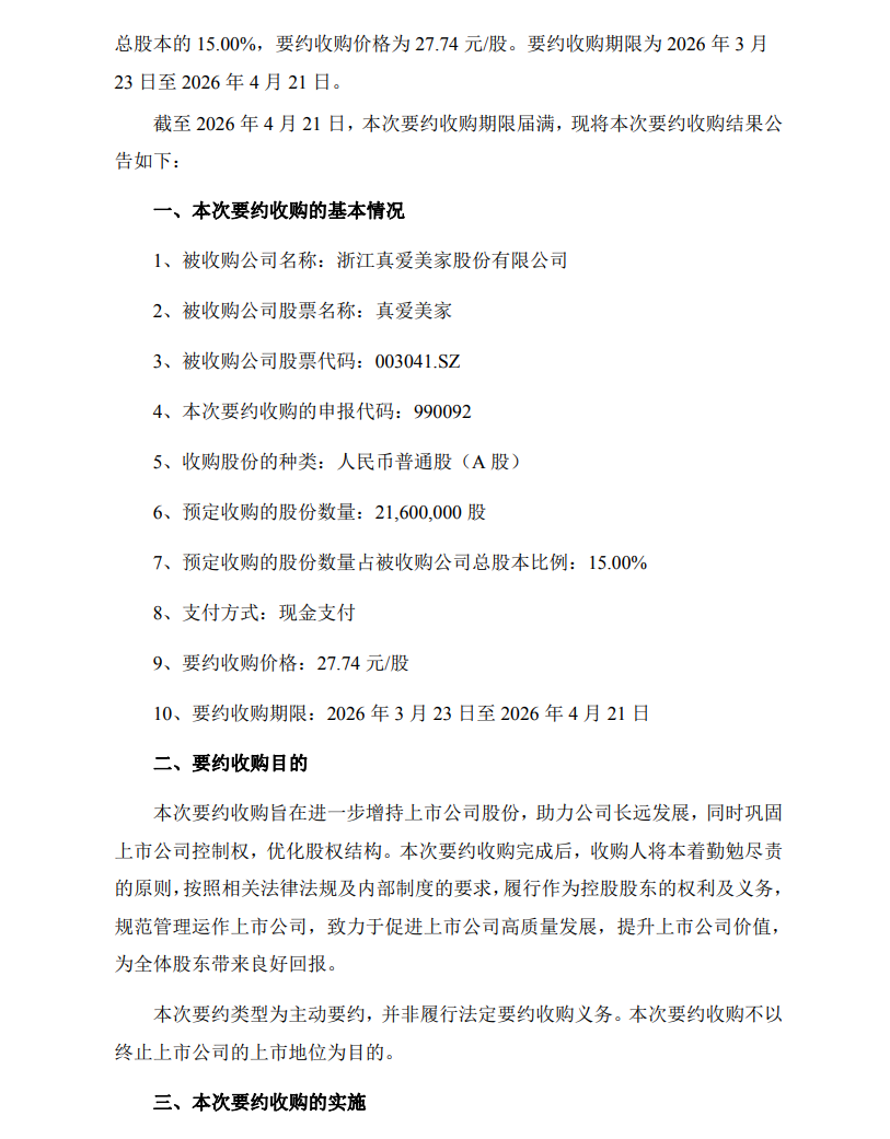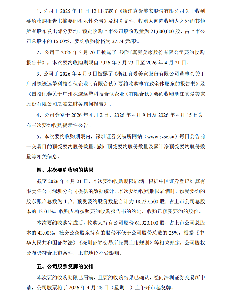 4月27日,真爱美家(003041.SZ)公告称,截至2026年4月21日,本次要约收购期限届满,预受要约的股东账户总数为4户,预受要约股份数量合计为18,737,500股,占上市公司总股本的13.01%。收购人广州探迹远擎科技合伙企业(有限合伙)(以下简称“探迹远擎”或“收购人”)将按照《浙江真爱美家股份有限公司要约收购报告书》的约定,收购已预受要约的股份。