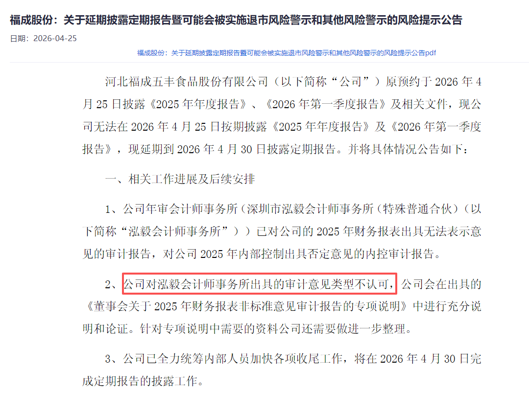 4月24日公告显示,泓毅所已对福成股份2025年财务报表出具无法表示意见的审计报告,对公司2025年内部控制出具否定意见的内控审计报告。