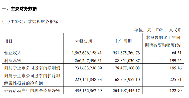 公司2026年一季度实现营业收入15.64亿元,同比增长64.31%;归母净利润2.32亿元,同比增长195.16%。