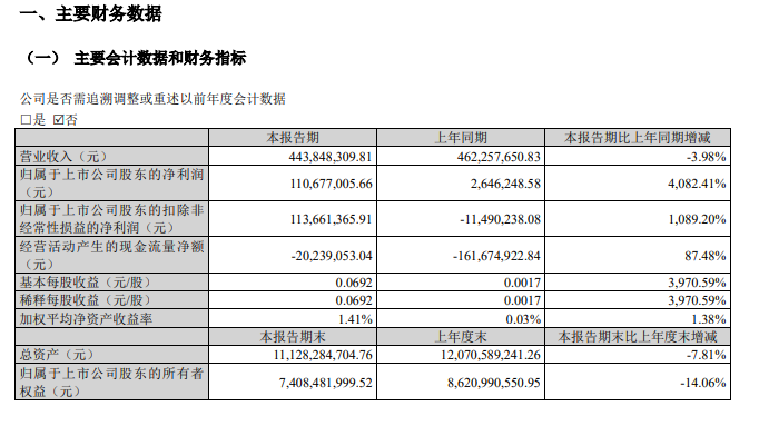2026年第一季度营业收入4.44亿元,同比下降3.98%。净利润1.11亿元,同比增长4082.41%。