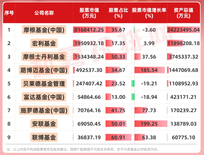 4月27日,据私募排排网,大摩、小摩、贝莱德等头部外资公募的最新调仓路线浮出水面。整体来看,外资公募对A股加仓动作明显,数据显示,2026一季度有6家进行了股票市值的增持,其中安联基金、路迈博基金在一季度的股票市值增长率分别高达199.25%、185.54%。