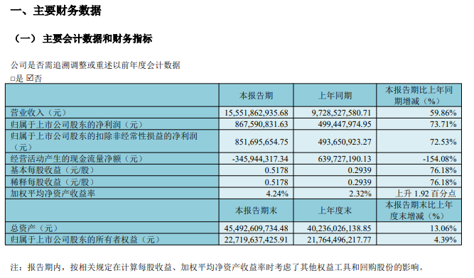 公司2026年第一季度实现营业收入155.52亿元,同比增长59.86%;归属于上市公司股东的净利润为8.68亿元,同比增长73.71%。