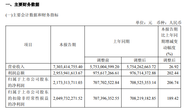 2026年第一季度营收为73.03亿元,同比增长26.92%;净利润为21.73亿元,同比增长206.74%。