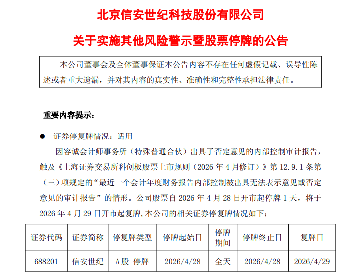 4月27日,信安世纪(688201.SH)公告,因容诚会计师事务所出具否定意见的内部控制审计报告,公司股票自2026年4月28日开市起停牌1天,4月29日复牌并实施风险警示,A股简称变更为ST信安。在风险警示期间,公司股票不进入风险警示板交易,涨跌幅仍为20%,但投资者当日累计买入数量不得超过50万股。公司董事会已启动整改并计划申请撤销风险警示。