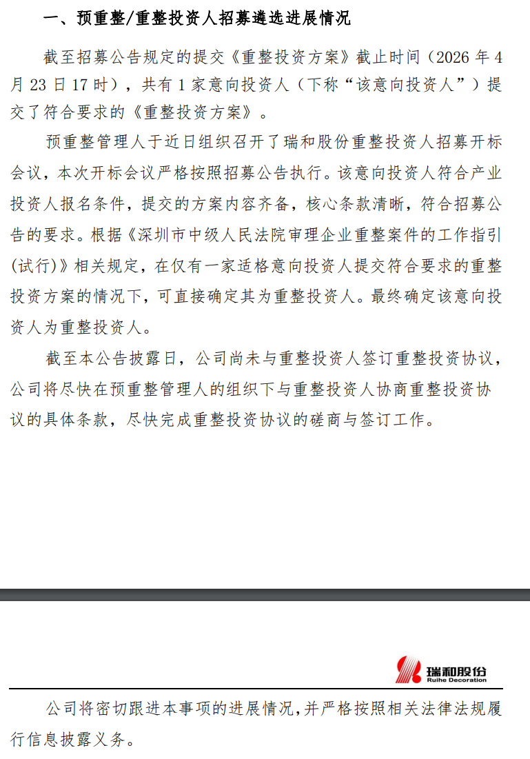 4月27日,ST瑞和(002620.SZ)发布公告称,截至招募公告规定的提交《重整投资方案》截止时间(2026年4月23日17时),共有1家意向投资人(下称“该意向投资人”)提交了符合要求的《重整投资方案》。