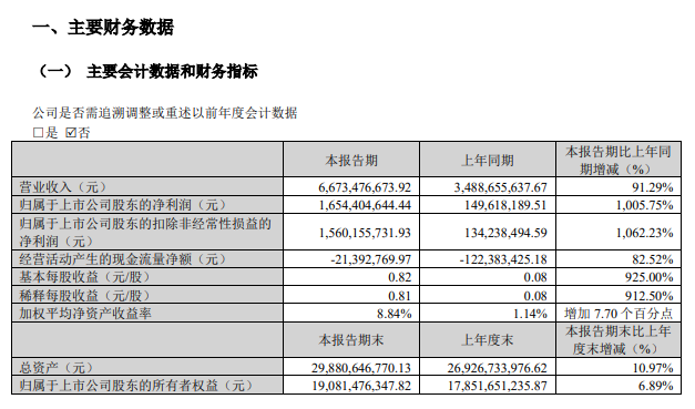 2026年第一季度营业收入66.73亿元,同比增长91.29%。净利润16.54亿元,同比增长1005.75%。