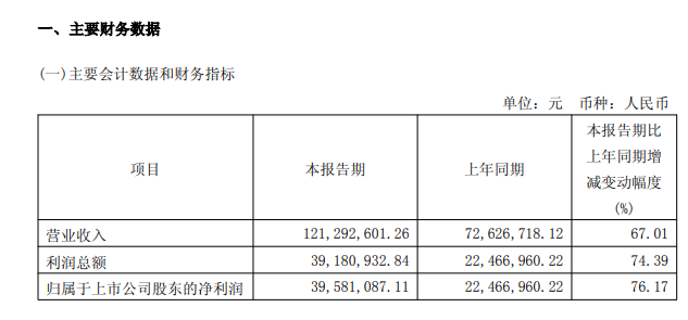2026年第一季度营业收入1.21亿元,同比增长67.01%。净利润3958.11万元,同比增长76.17%。