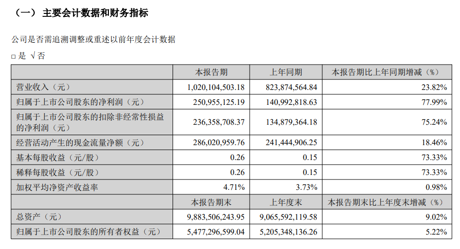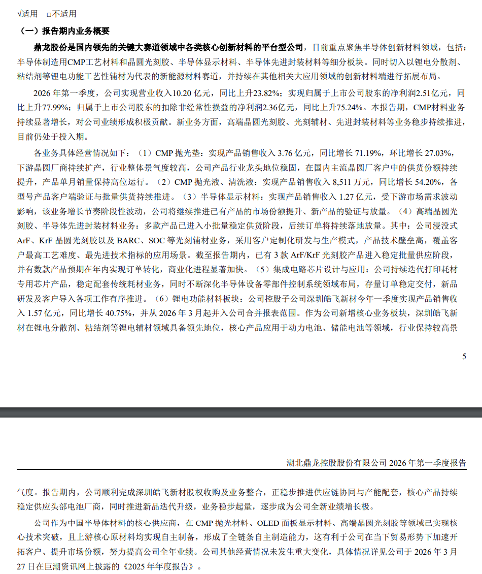 4月27日,鼎龙股份(300054.SZ)发布一季度财务报告。2026年第一季度实现营业收入10.20亿元,同比增长23.82%;归属于上市公司股东的净利润为2.51亿元,同比增长77.99%。业绩变动主要系CMP材料业务持续显著增长,对公司业绩形成积极贡献;同时,公司控股子公司深圳皓飞新材今年一季度实现产品销售收入1.57亿元,并从2026年3月起并入公司合并报表范围,逐步成为公司全新业绩增长极。