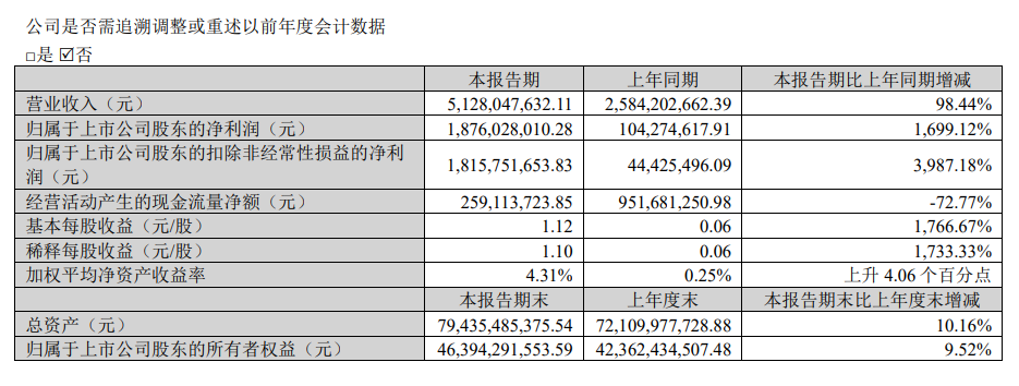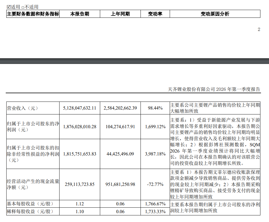 4月27日,天齐锂业(002466.SZ)发布2026年一季度业绩报告。2026年第一季度实现营业收入51.28亿元,同比增长98.44%;归属于上市公司股东的净利润为18.76亿元,同比增长1699.12%。