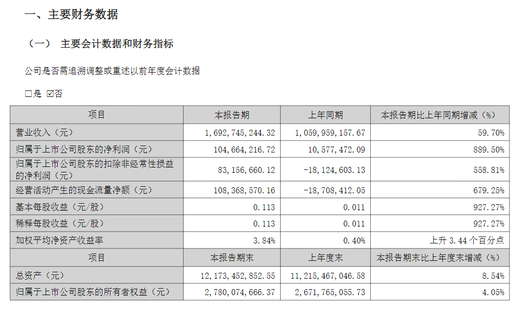 2026年第一季度营业收入16.93亿元,同比增长59.70%。净利润1.05亿元,同比增长889.50%。