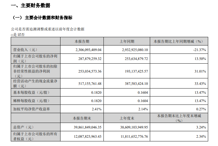 2026年第一季度营收为23.06亿元,同比下降21.37%;净利润为2.88亿元,同比增长13.50%。