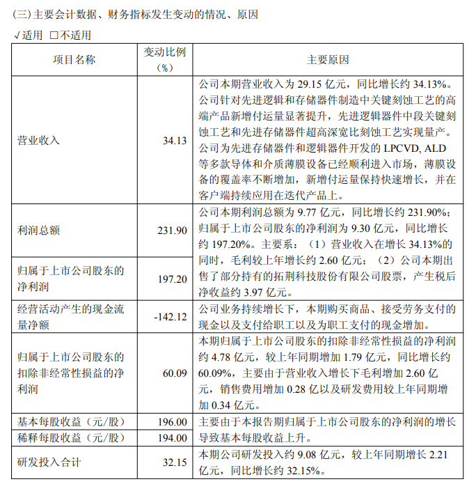 业绩变动主要系本期营业收入增长下毛利较上年增长约2.60亿元,以及公司本期出售了部分持有的拓荆科技(688072.SH)股份有限公司股票产生税后净收益约3.97亿元所致。公司针对先进逻辑和存储器件制造中关键刻蚀工艺的高端产品新增付运量显著提升。在先进存储器件制造工艺中,公司完全自主开发的针对超高深宽比刻蚀工艺的刻蚀机已有300多台反应器实现了稳定可靠的大规模量产。