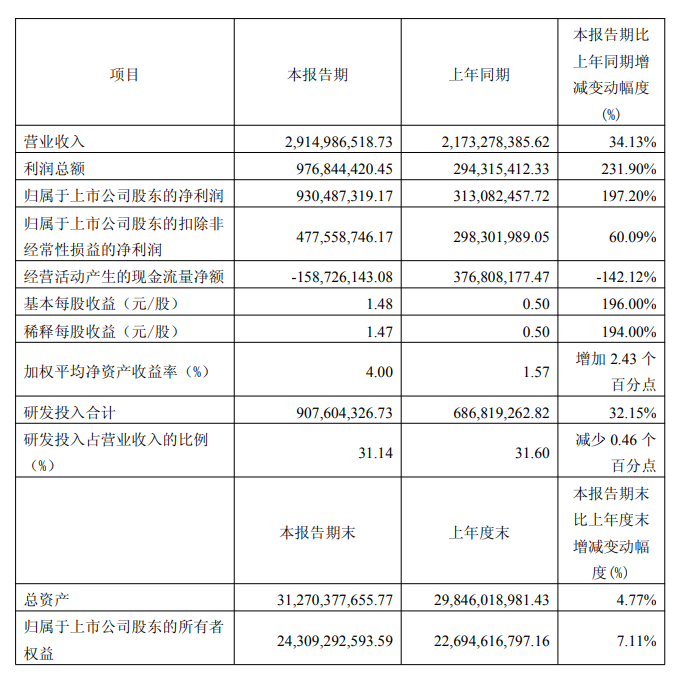 4月27日,中微公司(688012.SH)公告称,2026年第一季度实现营业收入29.15亿元,同比增长34.13%;归属于上市公司股东的净利润为9.30亿元,同比增长197.20%。