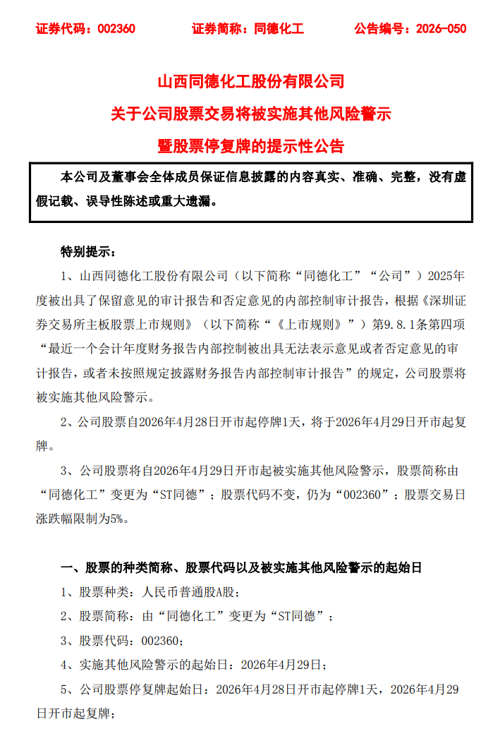 4月27日,同德化工(002360.SZ)公告称,因公司2025年度被出具否定意见的内部控制审计报告,触及《深圳证券交易所主板股票上市规则》相关规定,公司股票交易将被实施其他风险警示。公司股票自4月28日开市起停牌1天,将于4月29日开市起复牌并实施其他风险警示。实施后,股票简称由“同德化工”变更为“ST同德”,股票代码不变,日涨跌幅限制由10%变为5%。公司董事会表示将督促管理层采取有效措施消除影响,完善内控体系,争取尽早撤销其他风险警示。目前公司生产经营正常。