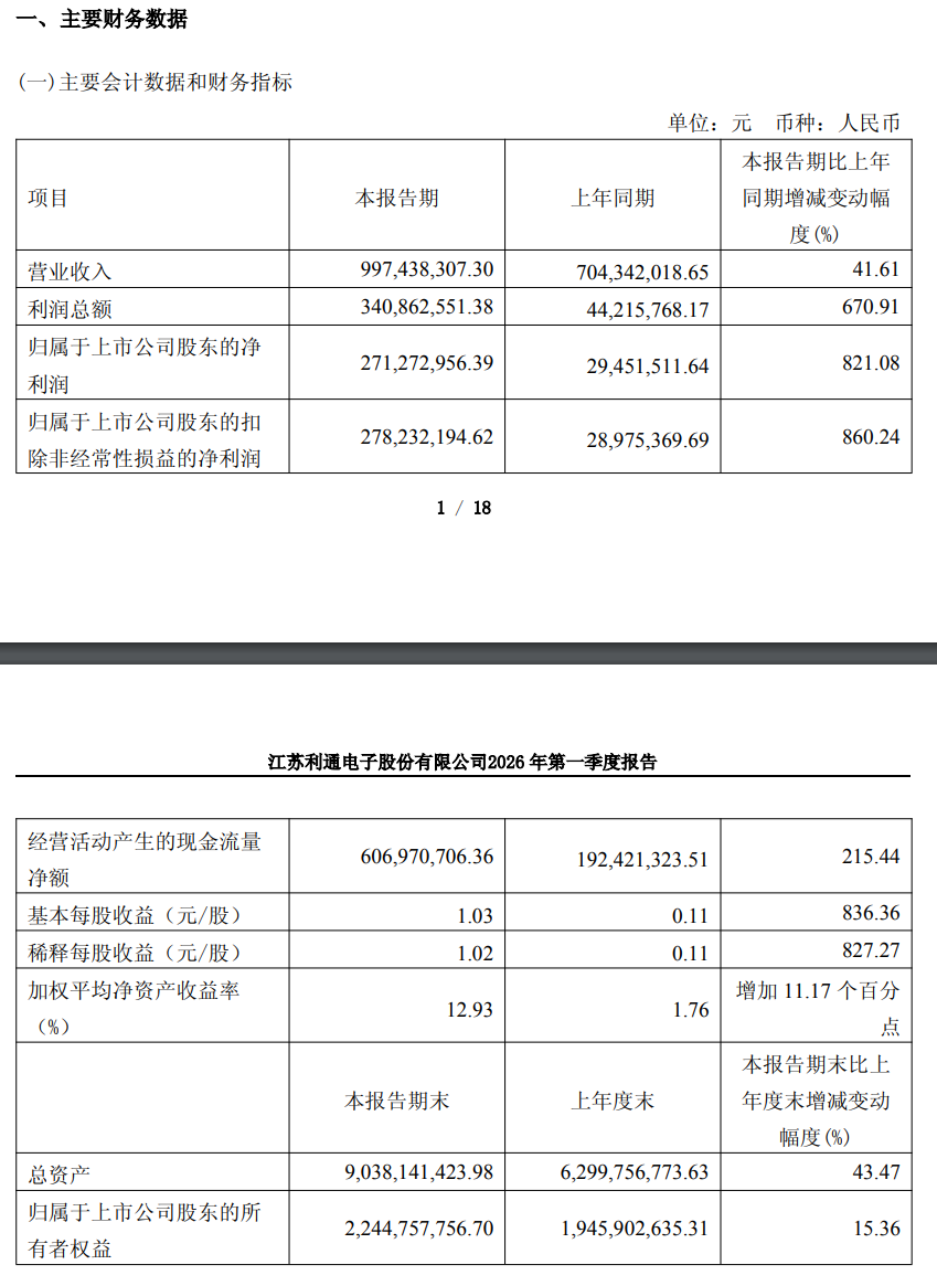 4月27日,利通电子(603629.SH)公告称,2026年第一季度实现营业收入9.97亿元,同比增长41.61%;归属于上市公司股东的净利润为2.71亿元,同比增长821.08%。业绩变动主要系本期算力业务增加所致。