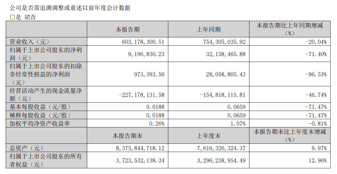 4月27日,西部材料(002149.SZ)公告称,2026年第一季度实现营业收入6.03亿元,同比下降20.04%;归属于上市公司股东的净利润为919.68万元,同比下降71.40%。业绩变动主要是由于:1、钛制品、金属复合板订单下降营业收入减少;2、产品结构中附加值高的钛合金产品占比下降。