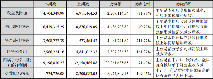 1、钛制品、金属复合板订单下降营业收入减少;2、产品结构中附加值高的钛合金产品占比下降。