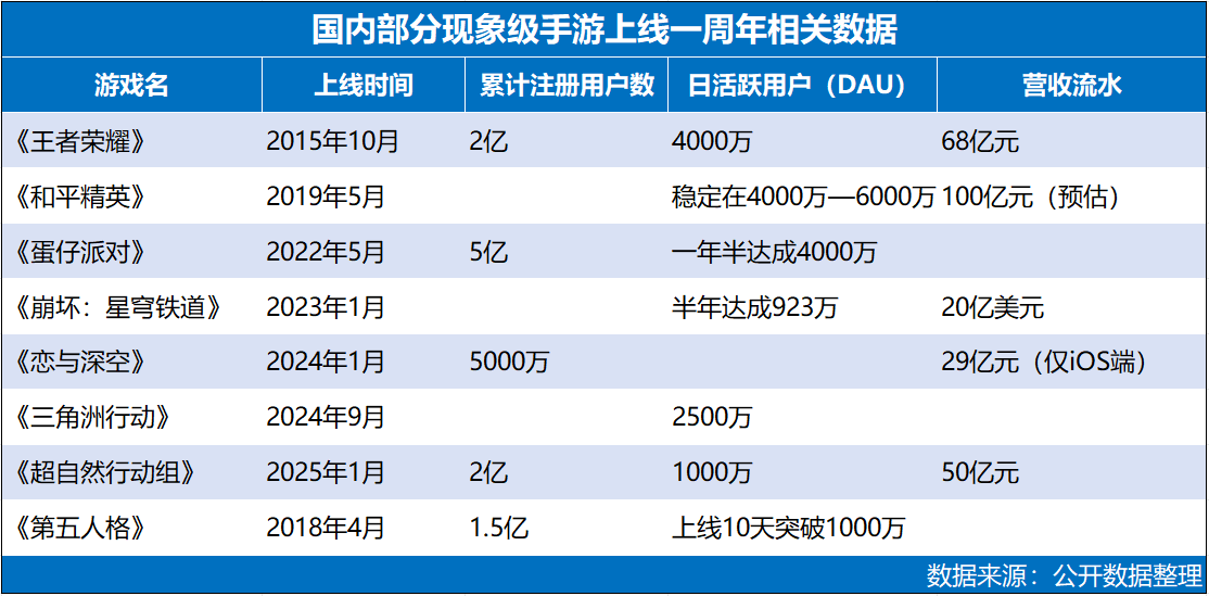 为进一步了解数据成色,财闻梳理了部分知名手游的一周年成绩,结果发现,虽与《王者荣耀》、《和平精英》这类“国民级”手游有所差距,但《超自然行动组》的确已经触达了行业公认的“现象级”手游门槛(通常为1000万—2000万的DAU水平)。