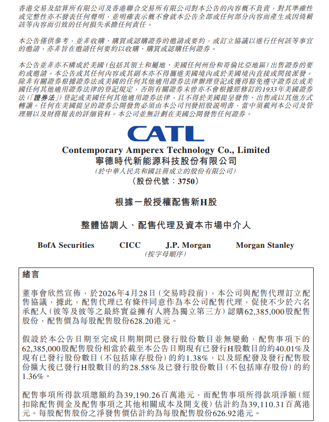 4月28日,宁德时代(03750.HK)在港交所公告,董事会欣然宣布,于2026年4月28日(交易时段前),本公司与配售代理订立配售协议,据此,配售代理已有条件同意作为本公司配售代理,促使不少于六名承配人认购62,385,000股配售股份,配售价为每股配售股份628.20港元。配售事项所得款项总额约为391.9亿港元,而配售事项所得款项净额(经扣除配售佣金及配售事项之其他相关成本及开支后)估计约为391.1亿港元。本次配售所得净募集资金将用于全球新能源项目建设和零碳业务布局、研发投入、补充日常营运资金及其他一般企业用途。