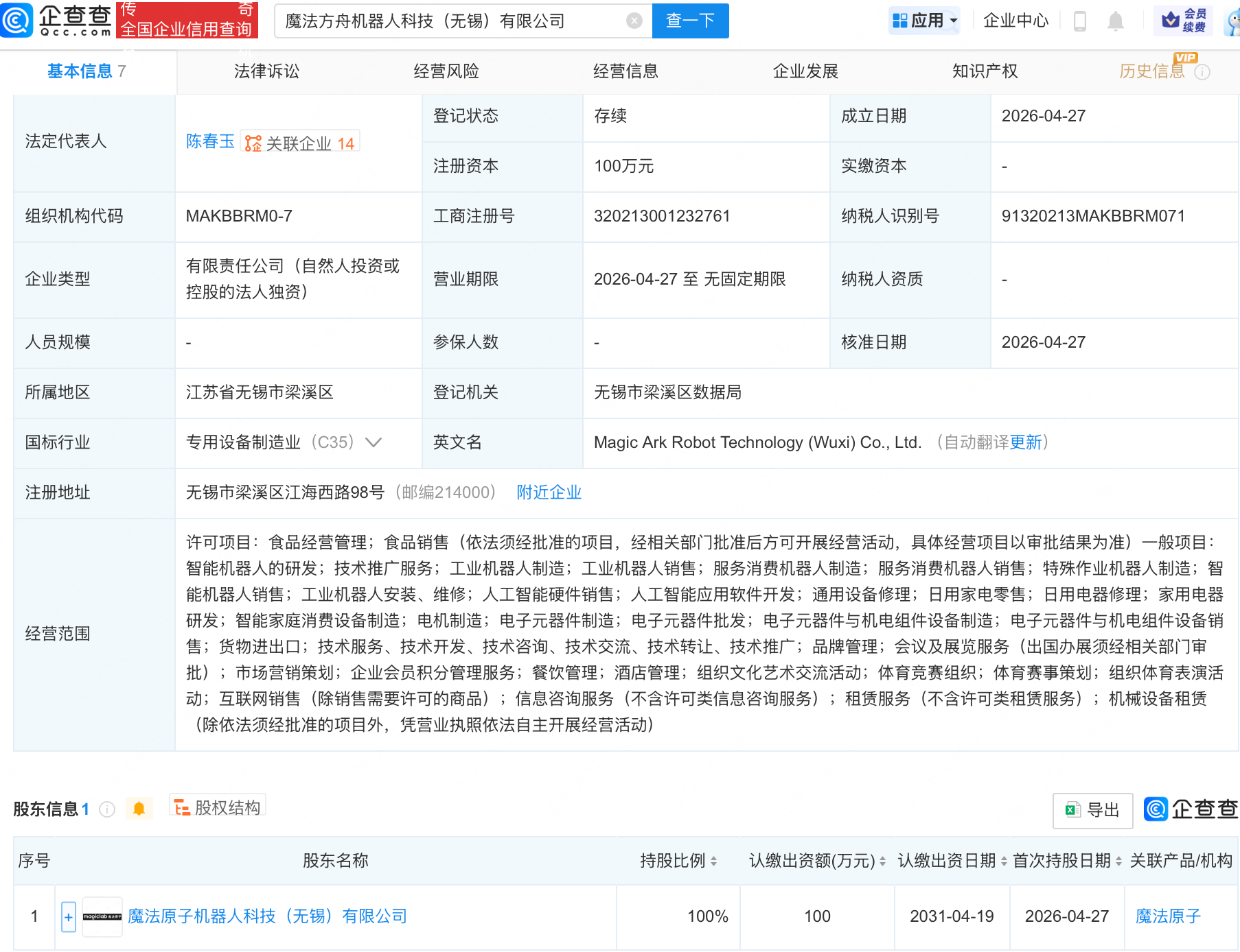 企查查APP显示,近日,魔法方舟机器人科技(无锡)有限公司成立,经营范围包含:智能机器人销售;工业机器人安装、维修;人工智能硬件销售;人工智能应用软件开发等。企查查股权穿透显示,该公司由魔法原子机器人科技(无锡)有限公司全资持股。