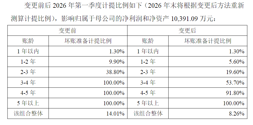 从公告看,以账龄为3~4年的应收账款为例,过去的坏账准备计提比例为100%,一季度变更后为53.7%。如果按组合整体看,计提比例由14.01%降至8.26%。要计提的坏账金额显著减小,相应增厚当期利润。