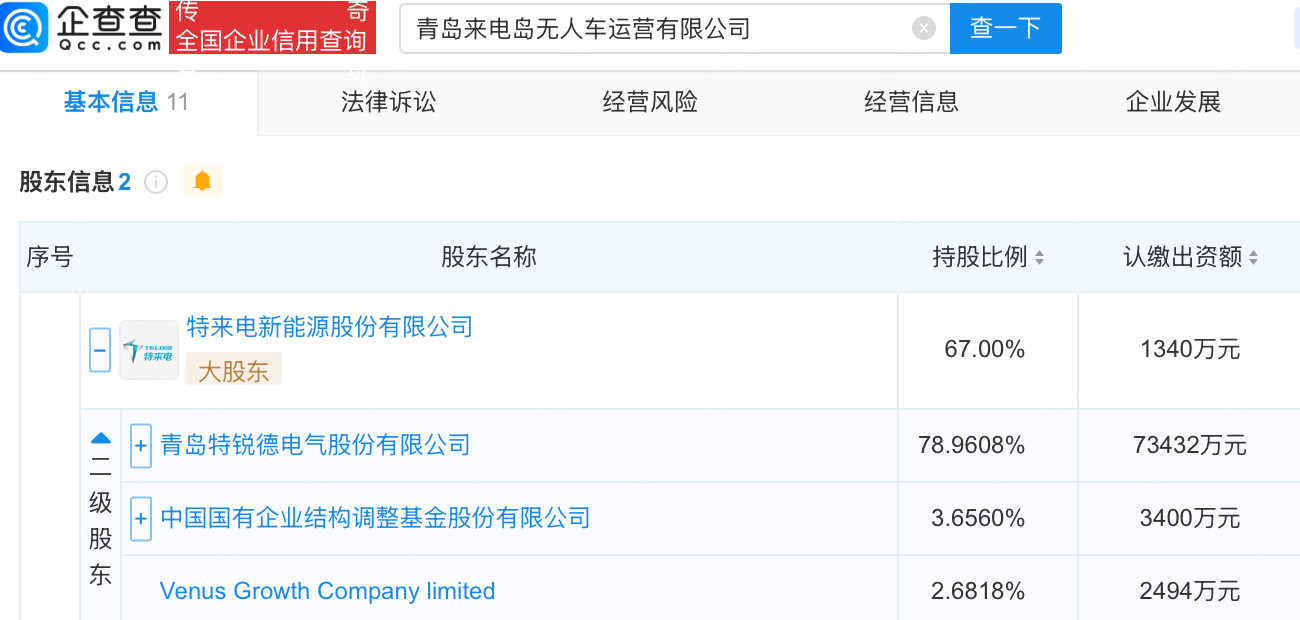 企查查APP显示,近日,青岛来电岛无人车运营有限公司成立,注册资本2000万元,经营范围包含:电动汽车充电基础设施运营;集中式快速充电站;机动车充电销售;充电桩销售等。企查查股权穿透显示,该公司由特锐德(300001.SZ)旗下特来电新能源股份有限公司、新石器慧通(北京)科技有限公司共同持股。