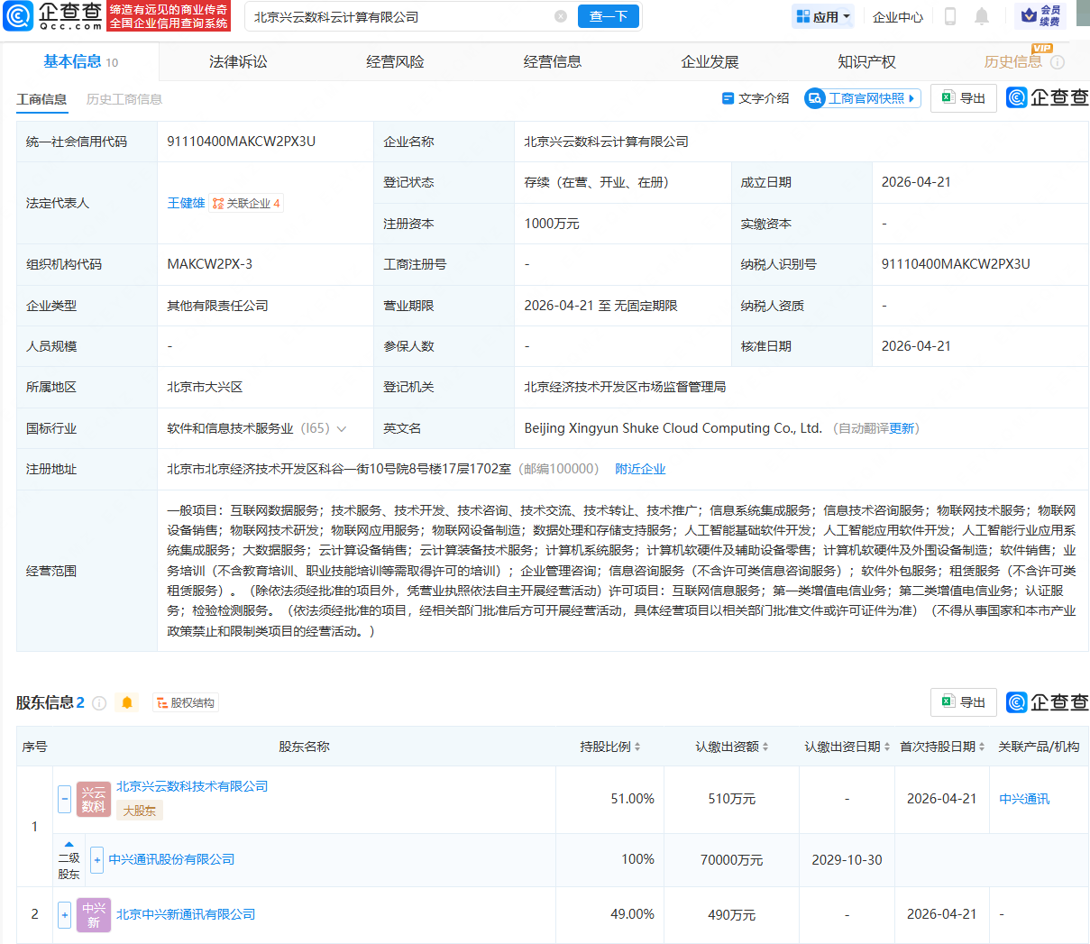 企查查APP显示,近日,北京兴云数科云计算有限公司成立,法定代表人为王健雄,注册资本为1000万元,经营范围包含:物联网技术研发;物联网应用服务;人工智能基础软件开发;人工智能应用软件开发等。企查查股权穿透显示,该公司由中兴通讯(000063.SZ)全资子公司北京兴云数科技术有限公司、北京中兴新通讯有限公司共同持股。