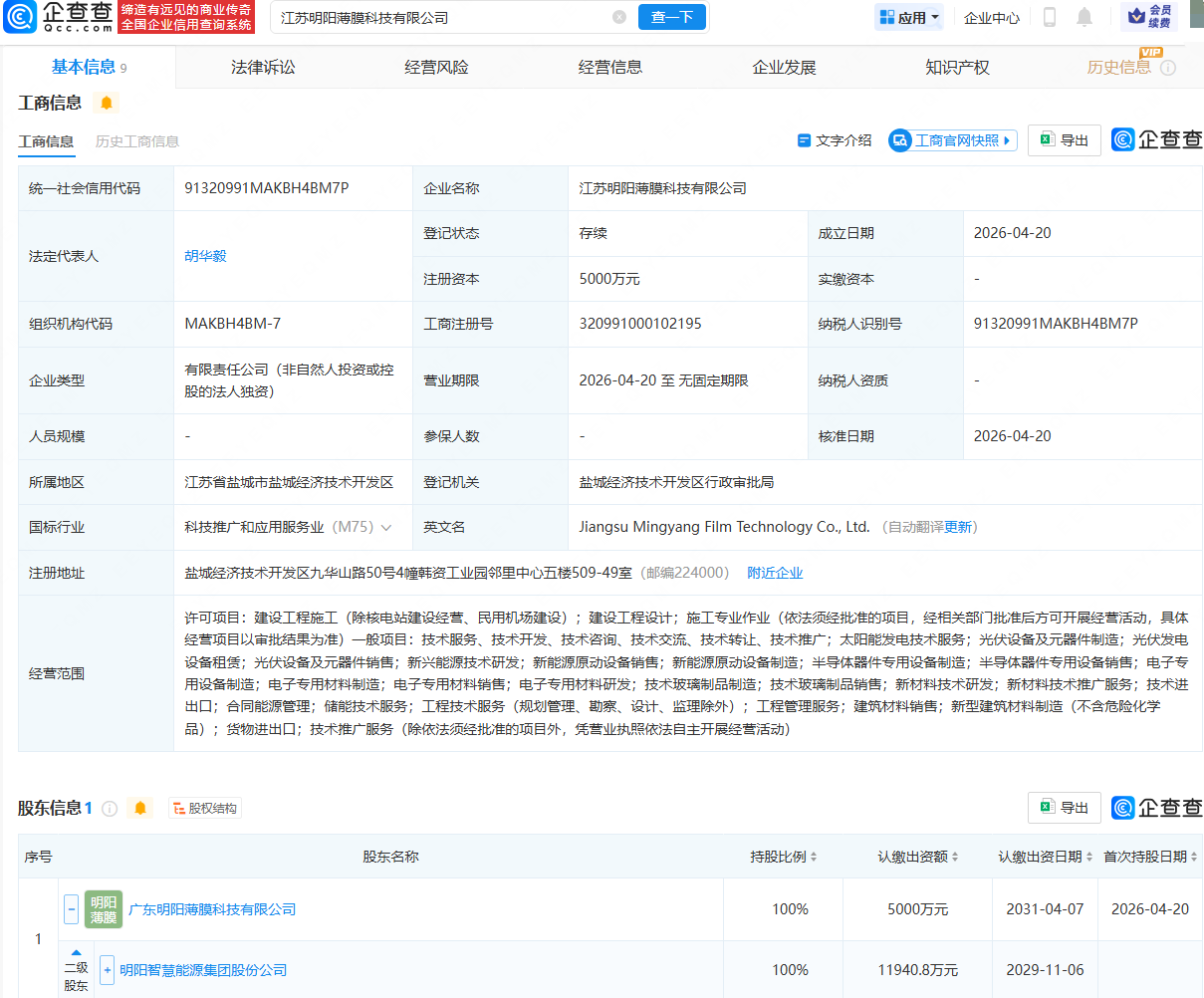 企查查APP显示,近日,江苏明阳薄膜科技有限公司成立,法定代表人为胡华毅,注册资本为5000万元,经营范围包含:太阳能发电技术服务;光伏设备及元器件制造;新能源原动设备制造;电子专用材料制造等。企查查股权穿透显示,该公司由明阳智能(601615.SH)间接全资持股。