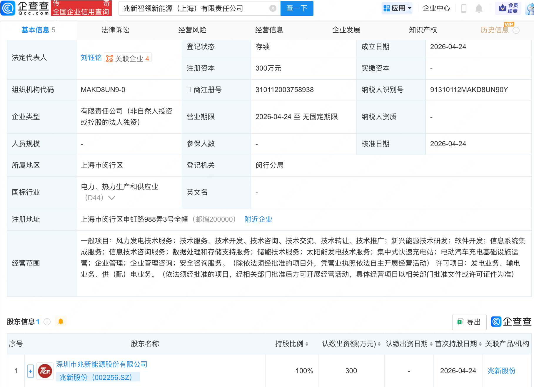 企查查APP显示,近日,兆新智领新能源(上海)有限责任公司成立,经营范围包含:储能技术服务;太阳能发电技术服务;集中式快速充电站;电动汽车充电基础设施运营等。企查查股权穿透显示,该公司由兆新股份(002256.SZ)全资持股。