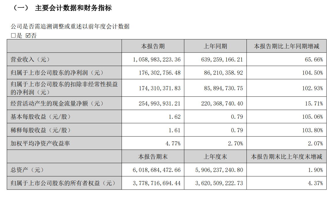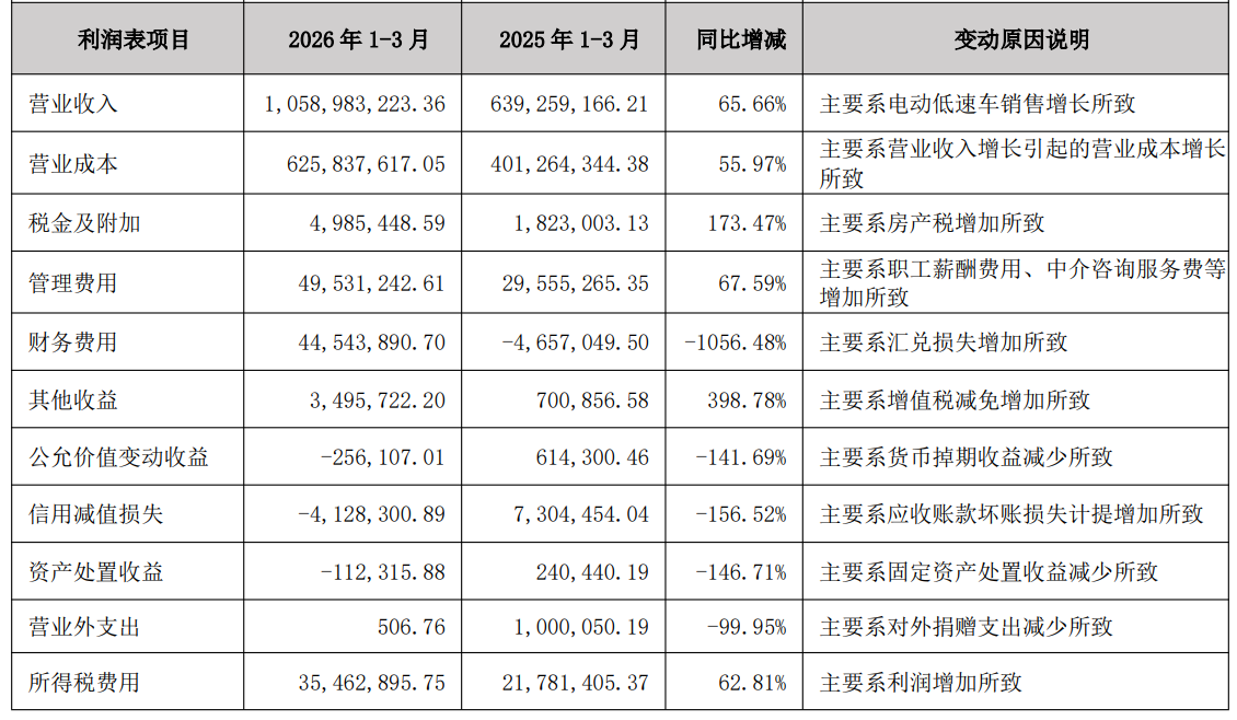 2026年第一季度实现营业收入10.59亿元,同比增长65.66%;归属于上市公司股东的净利润为1.76亿元,同比增长104.50%。业绩变动主要系电动低速车销售增长所致。