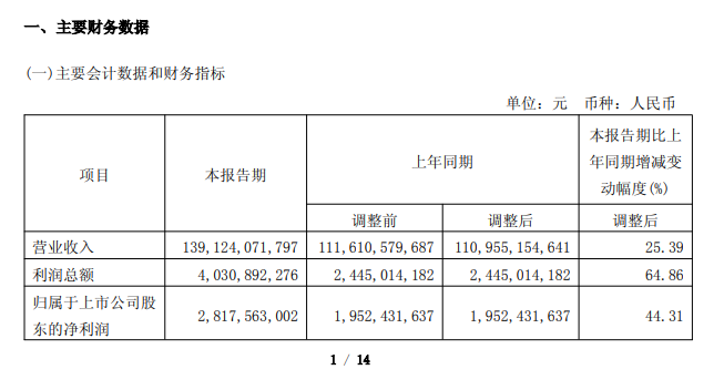 公司第一季度营收1391.2亿元,同比增长25.39%;净利润28.2亿元,同比增长44.31%。