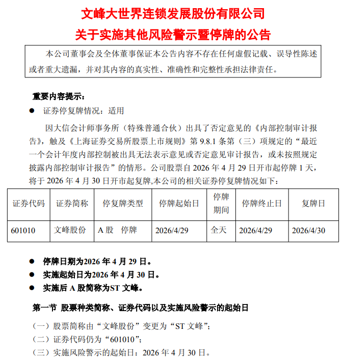 4月28日,文峰股份(601010.SH)公告称,因大信会计师事务所出具否定意见的内部控制审计报告,公司股票自2026年4月29日停牌1天,4月30日起实施其他风险警示,股票简称变更为ST文峰,日涨跌幅限制为5%。公司已制定整改措施,包括强化会计信息质量、优化采购和投资管理流程。
